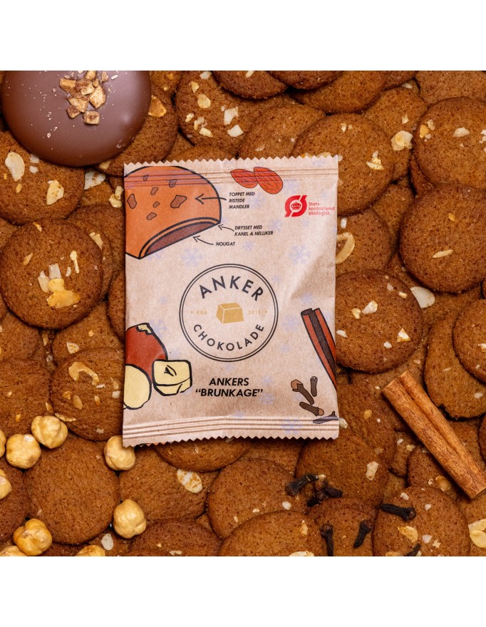Én af vores populærer "brunkager" pakket individuelt ind. Brunkagen består af nougat drysset med kanel og nelliker, overtrukket med mælkechokolade og toppet med ristede mandler