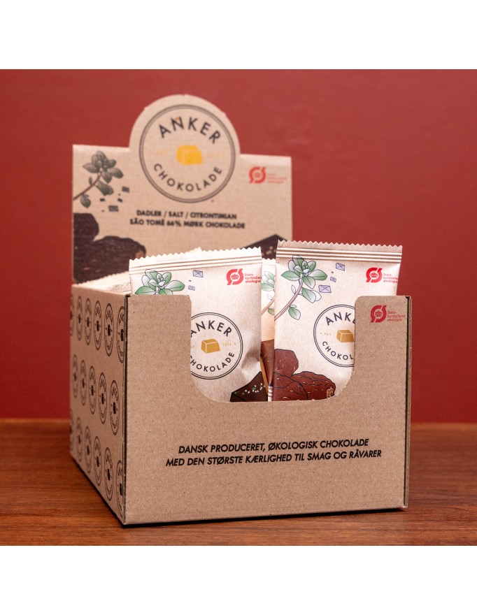 40 stk af vores chokolader med Dadler / Læsø flagesalt / citrontimian / São Tomé 66% mørk chokolade pakket individuelt ind.