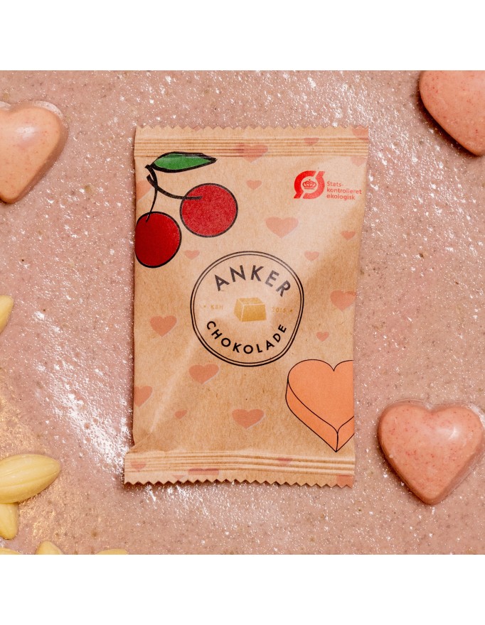 Én af vores chokolader med kirsebær / Grand Cru hvid chokolade pakket individuelt ind.
